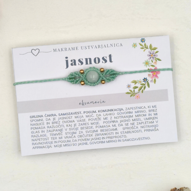 Zapestnica z akvamarinom je ustvarjena kot podpora grleni čakri – prostoru komunikacije, samozavesti in notranje jasnosti.