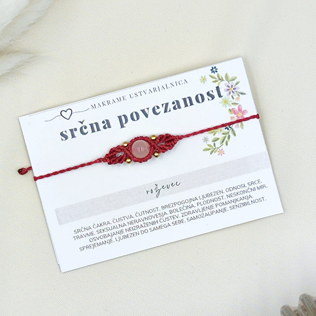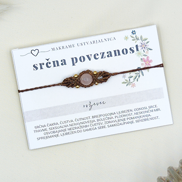 Zapestnica Srčna povezanost je ustvarjena z namenom, da te nežno poveže s tvojim srcem. Roževec je kristal brezpogojne ljubezni, ki odpira srčno čakro in pomaga pri zdravljenju čustvenih ran, preteklih bolečin in neravnovesij v odnosih.