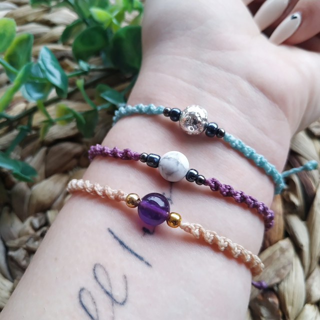 Material: naravni kristali, kroglice iz srebra ali medenine, povoščena vrvica